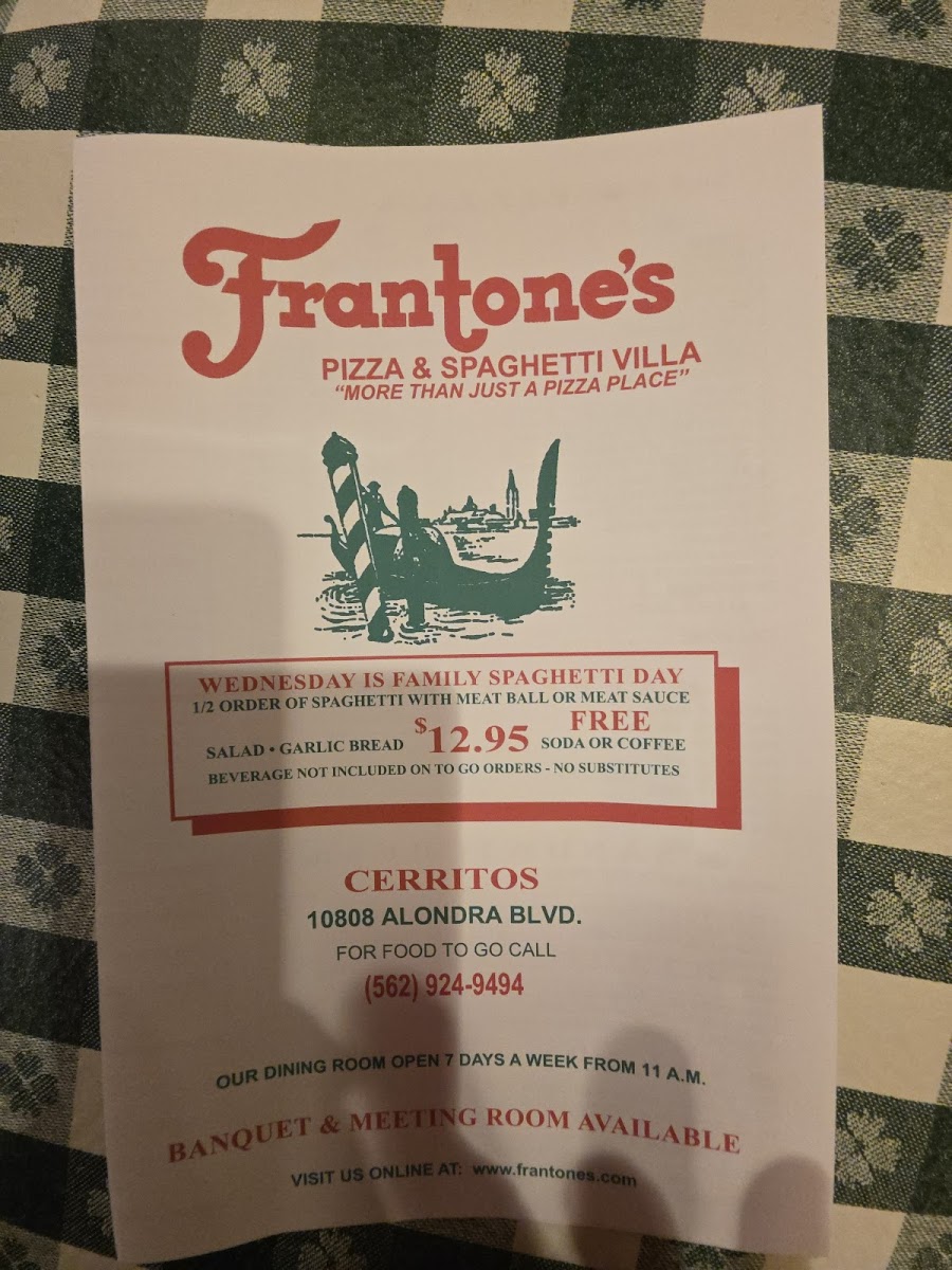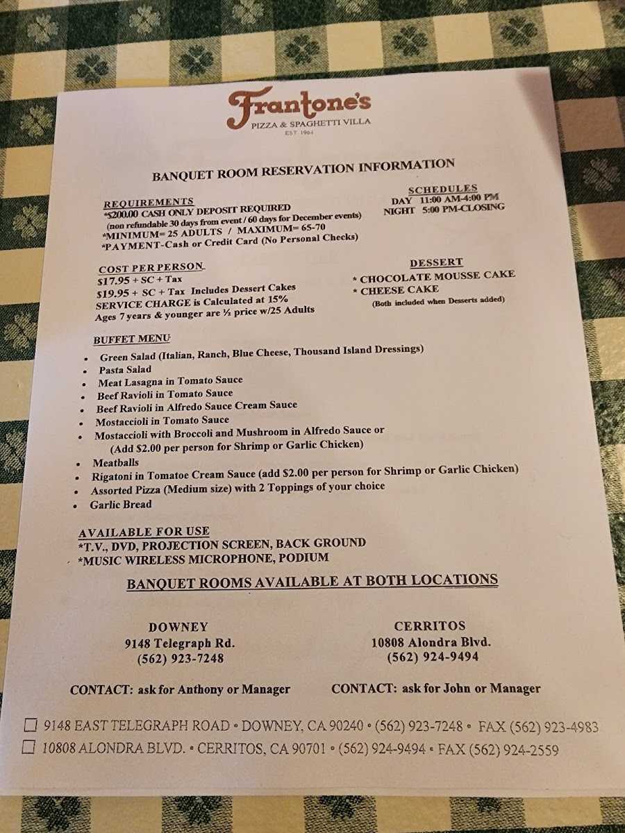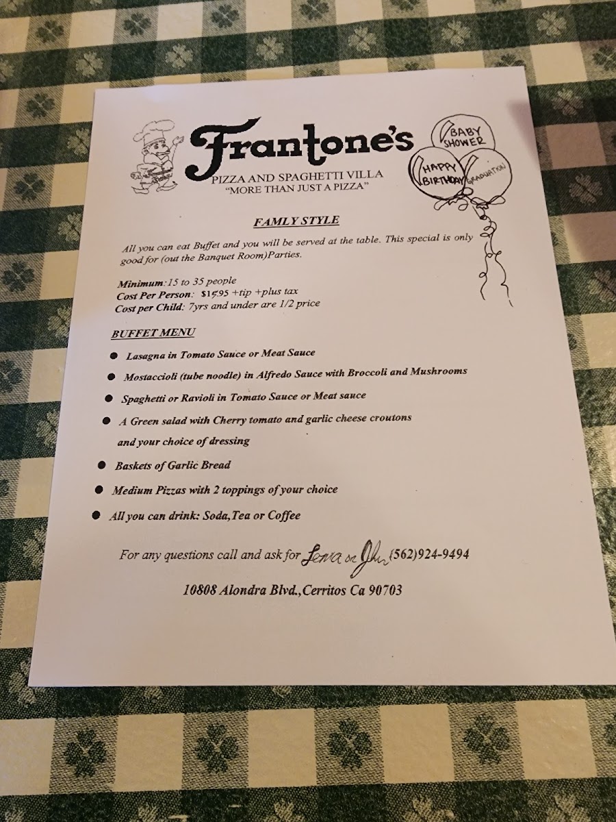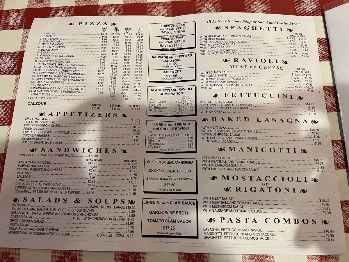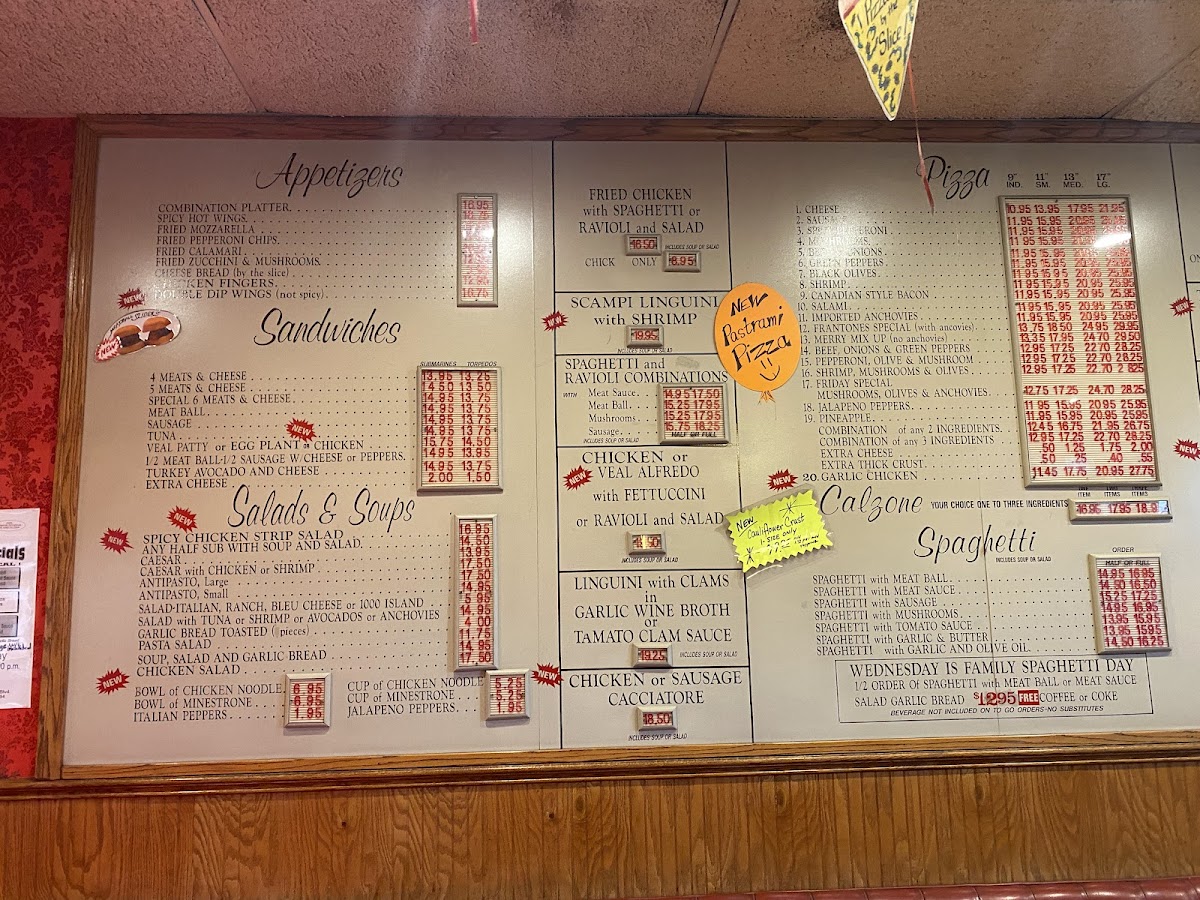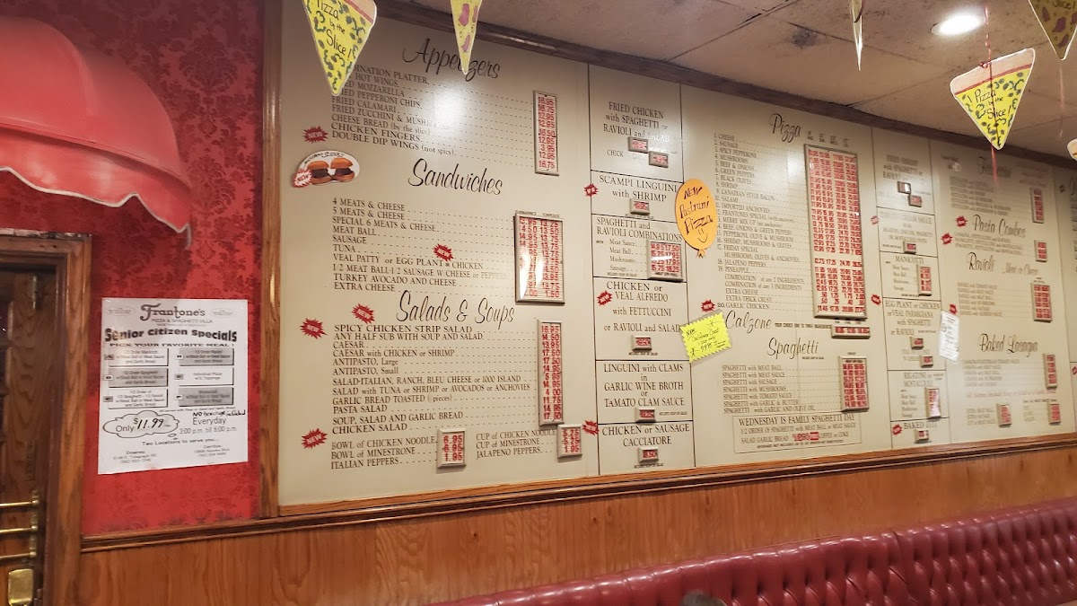 Frantone's Pizza & Spaghetti Villa offers a delightful menu steeped in classic Italian flavors, sure to satisfy pizza and pasta lovers alike. Their extensive selection includes hearty spaghetti dishes like Spaghetti with Sausage & Tomato Sauce and Spaghetti with Meatball & Tomato Sauce, each crafted with rich, savory sauces that evoke homemade comfort. For pasta enthusiasts, the variety of combos—such as Lasagna, Fettuccine & Ravioli—showcases authentic Italian layers and textures, balancing creamy, tangy, and meaty notes. The ravioli options, from Meat Sauce to Alfredo Sauce, highlight versatility and depth in flavors. Customers often praise the toasty garlic bread and the cozy, nostalgic ambiance that feels like stepping into a vintage villa. Whether you crave a classic pastrami pizza or a robust antipasto salad, the menu’s rich options combined with excellent service make Frantone’s a cherished spot. It’s a savory journey that feels both timeless and warmly inviting.